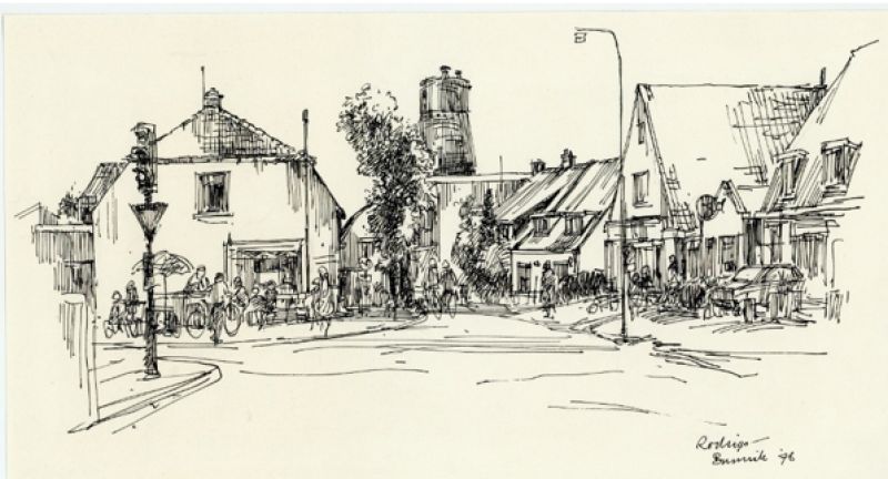 1743 Smederij op Gezicht op de Bunniske Brink vanaf de Dorpsstraat. Tekening door H. de Winter